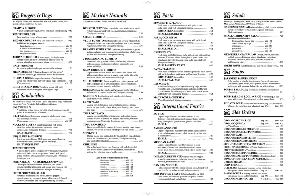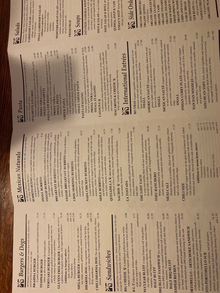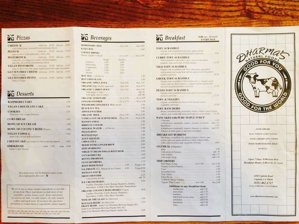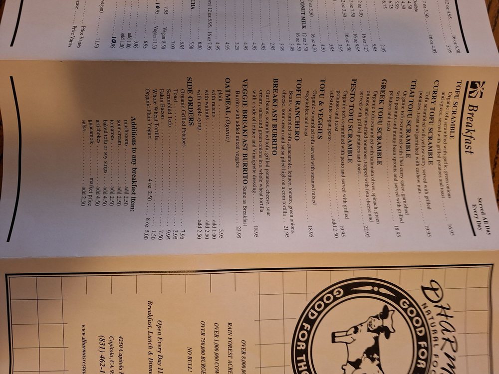 Dharma’s Restaurant, located in Capitola, CA, offers a diverse menu catering to vegan, vegetarian, and gluten-free diets. With options for delivery, takeout, and catering, this restaurant provides convenience alongside its delicious dishes. Their international entrees like the Bo Thai Saute and American Saute showcase the creativity and flavor of their vegan offerings. For a taste of Mexico, try the Burrito Bueno or Veggie Burrito. If sandwiches are more your style, the Big Cheese Sandwich and BLT Sandwich are sure to satisfy. The restaurant also provides a range of amenities such as outdoor seating, wheelchair accessibility, and even gender-neutral restrooms. With a commitment to sustainability through compostable containers and reusable tableware, Dharma's Restaurant offers not only tasty food but a conscientious dining experience.