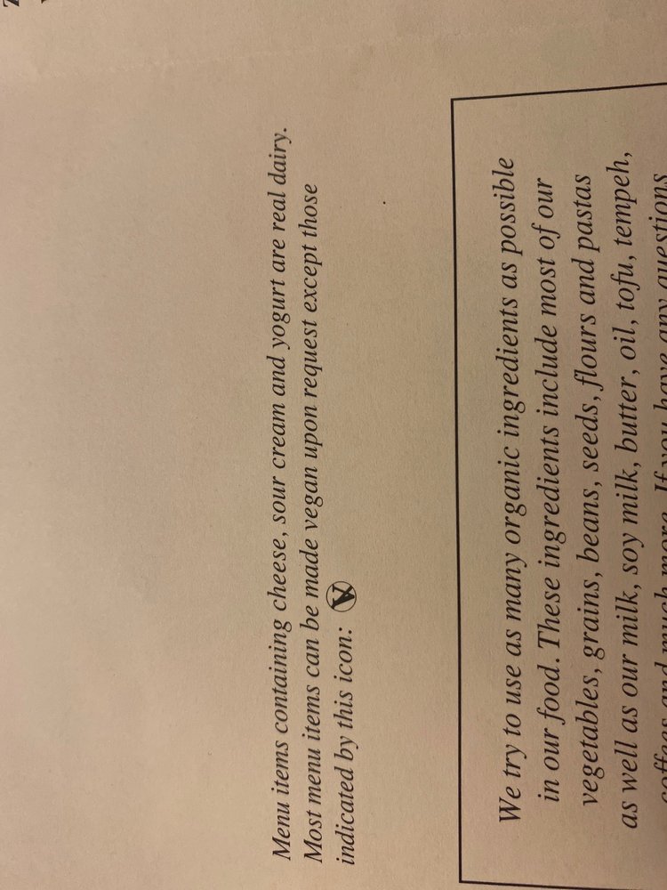 Our beans, scrambled tofu, grilled potatoes, cheese, sour cream, and green onions in a whole wheat tortilla with a side of lettuce with vinaigrette dressing and salsa.